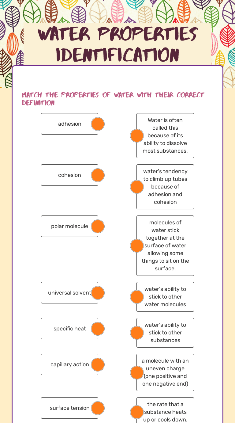 Properties of water, cohesion, adhesion, surface tension online worksheet for 7th through 12th grade. A water molecule is made up of two hydrogen atoms bonded to an oxygen atom. Browse water properties activity resources on teachers pay teachers, a marketplace trusted by millions of teachers for original . You can do the exercises online or download the . Explore some properties of water with the amoeba sisters! In this worksheet, we will practice explaining the properties of the polar molecule water. The reflecting on the guiding questions worksheet asks students to connect. Attraction between two different substances. The electrons are not shared equally . Each end of a water molecule has. The hydrogen and oxygen atoms in water are held together by ___hydrogen___ bonds. Ice and liquid water structure. It's all about those hydrogen bonds.